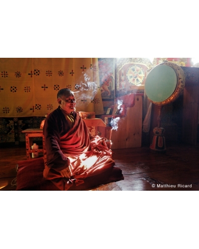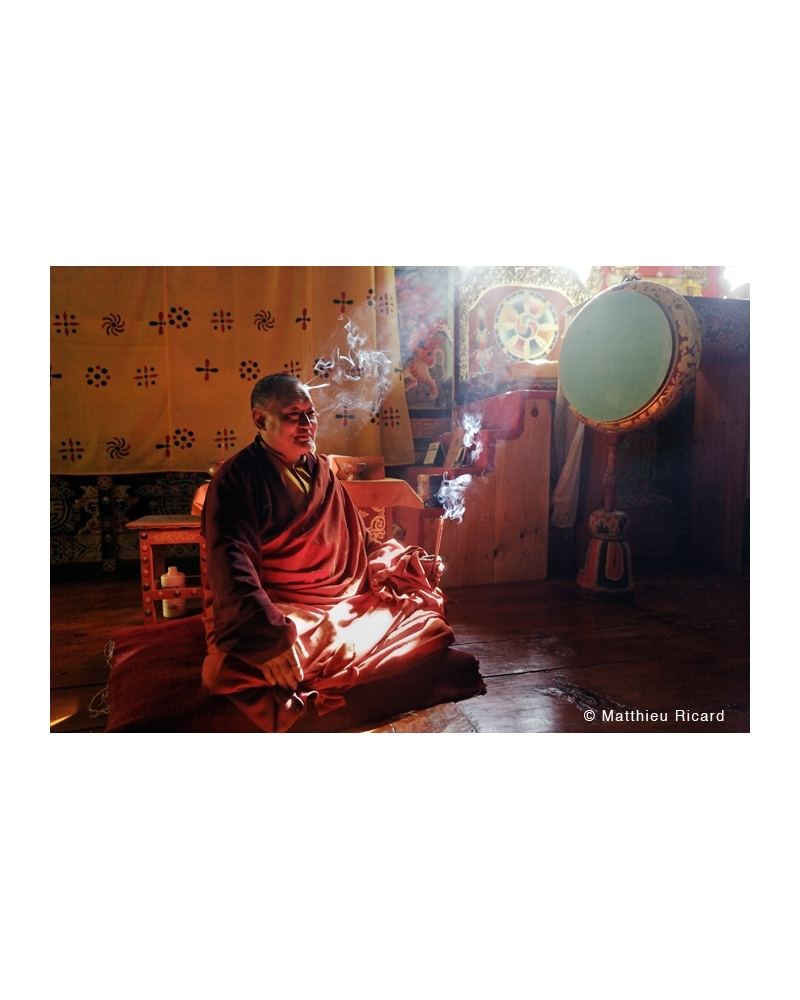 Lama Dorje Wangchuck with a stick of incense, making a fragrant offering to the Buddha. Kuje Lhakang , Bhutan, 2007. Order online a photographic work of art, signed by the hand of Matthieu Ricard, buddhist monk, photographer and author. He has also been the French interpreter of His Holiness the XIVth Dalai Lama since 1989. Some of the photographs in his collection are printed in limited edition, signed, numbered and delivered with a certificate of authenticity.