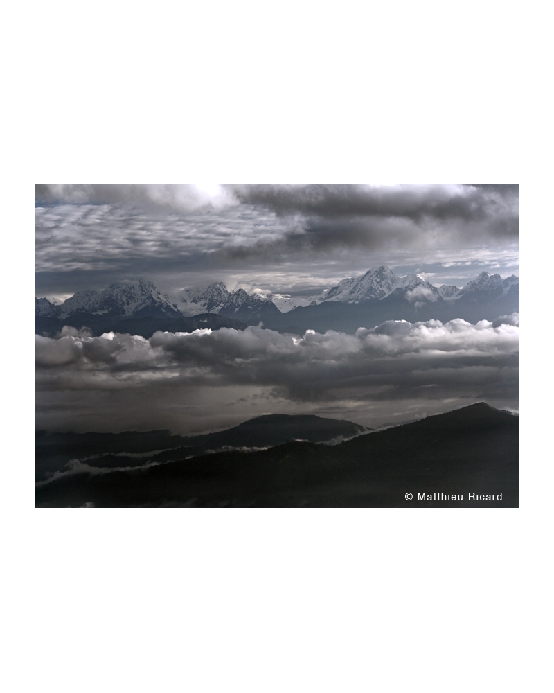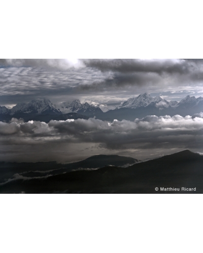 The Himalayan snow peaks (Langtang Range) emerge from the clouds, as if suspended in the air above the foothills. Seen from Namo Buddha, Nepal, July 2006. Purchase online a professional quality photographic print, signed by the hand of Matthieu Ricard, buddhist monk, photographer and author. He has also been the French interpreter of His Holiness the XIVth Dalai Lama since 1989. Some of the photographs in his collection are printed in limited edition, signed, numbered and delivered with a certificate of authenticity.
