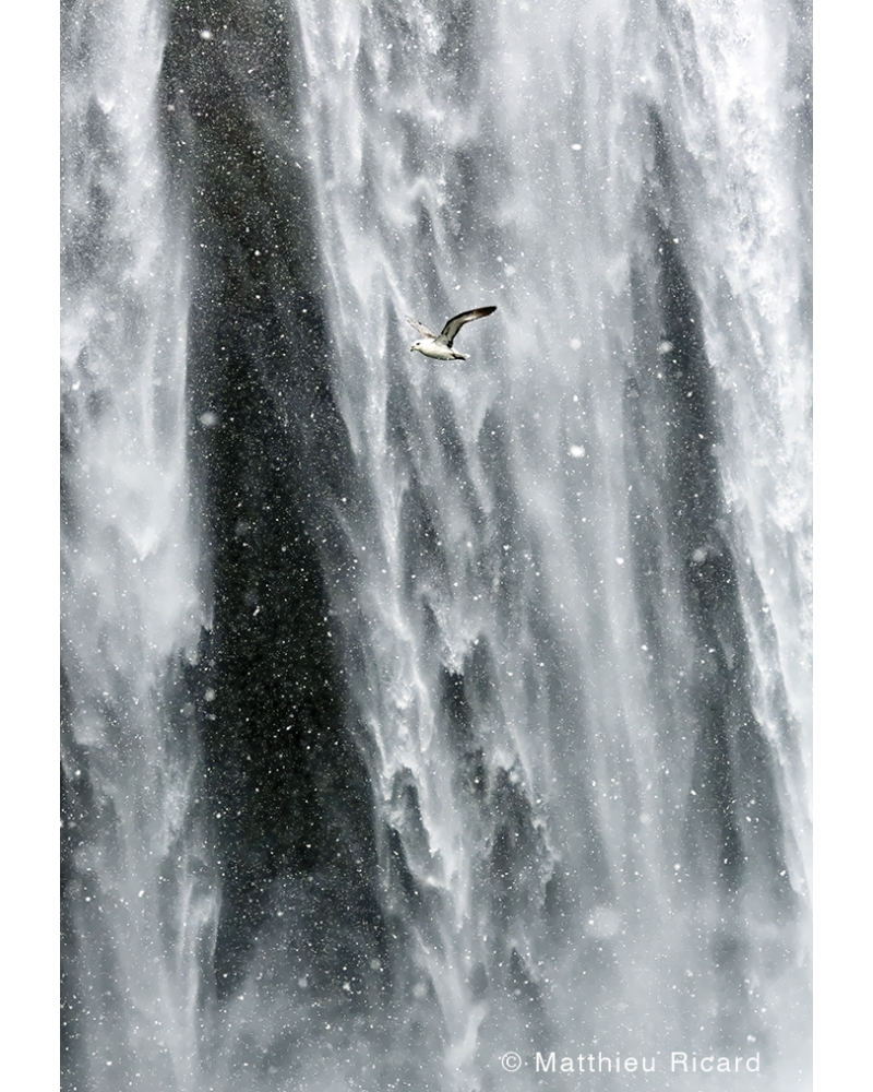 MR3927 Alors que la neige tombe, un pétrel fulmar (Fulmar glacialis) passe devant la chute de Skógafoss en Islande, haute de plus de 60 m. Au printemps de nombreux pétrels nichent sur les falaises qui entourent la chute. 2014.